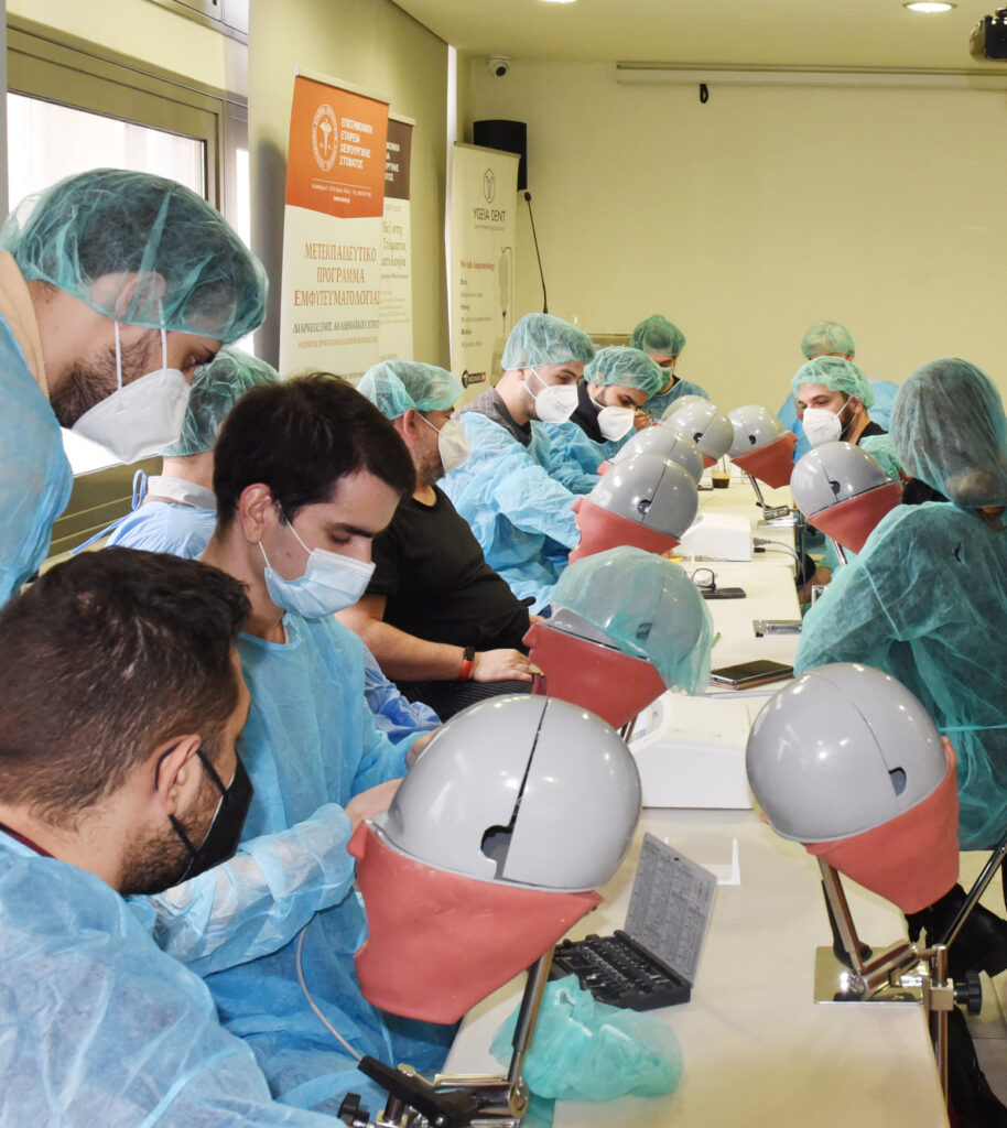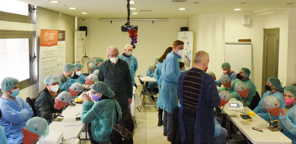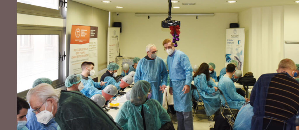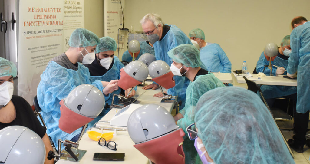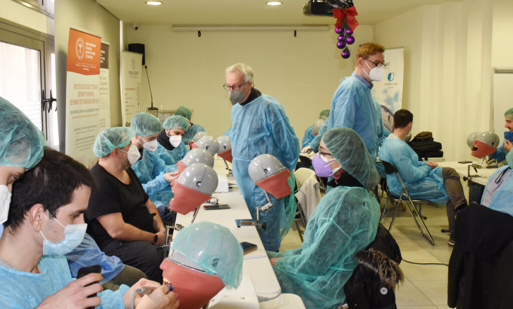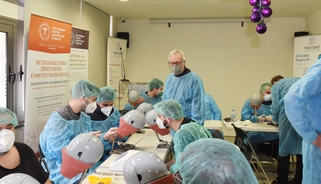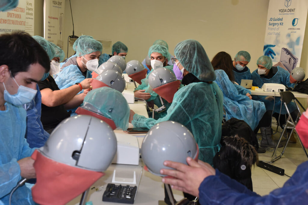 Kαθώς πλησιάζει ο καιρός που οι συμμετέχοντες θα τοποθετήσουν οι ίδιοι εμφυτεύματα σε δικούς τους ασθενείς, εξασκήθηκαν στην τοποθέτηση εμφυτευμάτων σε μοντέλα γνάθων (jaw phantoms). Επιπλέον, είχαν την ευκαιρία να ασκηθούν στη λήψη αποτυπωμάτων και να εκπαιδευτούν στην κατασκευή επιεμφυτευματικών προσθετικών αποκαταστάσεων από τον Αναπληρωτή Καθηγητή Οδοντιατρικής Σχολής ΕΚΠΑ, Προσθετολόγο κ. Καφούσια Νικόλαο. Τέλος, υπό την καθοδήγηση του Χειρουργού Οδοντιάτρου κ. Γιάκη Σωτήριου, οι συμμετέχοντες εκπαιδεύτηκαν στην υπολογιστικά καθοδηγούμενη εμφυτευματολογία και την κατασκευή χειρουργικού νάρθηκα. Η Ε.Ε.Χ.Σ. ευχαριστεί θερμά τους προσκεκλημένους ομιλητές για την πολύτιμη παρουσία τους στο Πρόγραμμα.